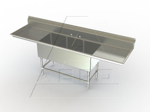 Aerospec™ Sink, three compartment, 111"W x 36"D x 42-1/2"H, 14/304 stainless steel construction, (3) 20"W x 30" front-to-back x 14" deep fabricated compartments, 24" drainboards on left & right, 10"H backsplash, (2) sets of 8" OC splash mount faucet holes, raised rolled edges on front & sides, fully welded stainless steel gussets, 16/304 stainless steel legs with front & side cross bracing, adjustable stainless steel feet, Aero Hemmed Safety Edge™, KD, NSF