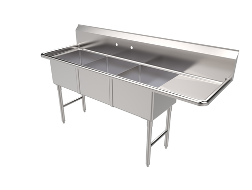 3-Compartment Sink w/ Right Drain Board, 18" x 18" compartments, 11-1/2” height backsplash 304 S/S 16 Ga. or 18 Ga. sink top and bowl 8”OC splash mount faucet hole 3-1/2” strainer hole, drain basket included Stainless steel legs with side cross bracing