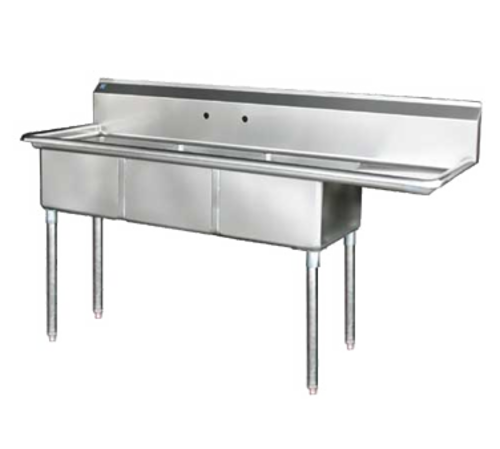 Sink, 3-compartments, 18" right drainboard, 18" front-to-back x 18"Wide x 12" deep bowls, 18/304 stainless steel, stainless steel legs with adjustable feet, NSF