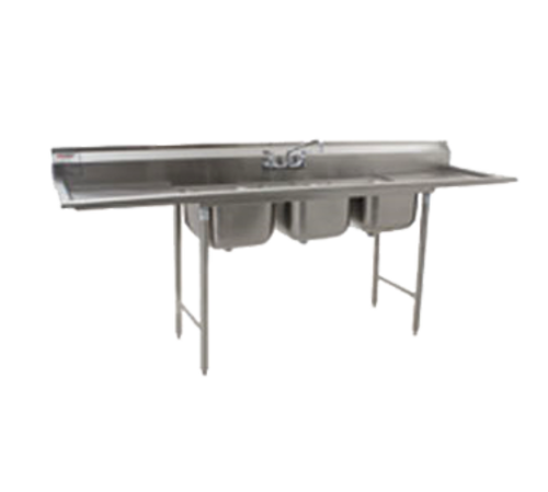 412 Series Sink, three compartment, 102"W x 27-1/2"D, 430 stainless steel construction, 16" wide x 20" front-to-back x 10-1/2" deep compartments, 24" drainboards on left & right, 9-1/2"H backsplash with 1" upturn & tile edge, 8" OC splash mount faucet holes, 2" euro-style edge on front & sides, includes (3) 3-1/2" basket drains, galvanized legs & side crossbracing, adjustable plastic bullet feet, NSF (FLYER)