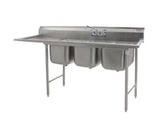 414 Series Sink, three compartment, 98-3/4"W x 31-3/4"D, 430 stainless steel top with 304 stainless steel sink bowls, coved corners, 24" x 24" x 13-1/2" deep compartments, 18" drainboard on left, 9-1/2"H backsplash with 1" upturn & tile edge, 8" OC splash mount faucet holes, 2" euro-style edge on front & sides, includes (3) 3-1/2" basket drains, galvanized legs & side crossbracing, adjustable plastic bullet feet, NSF