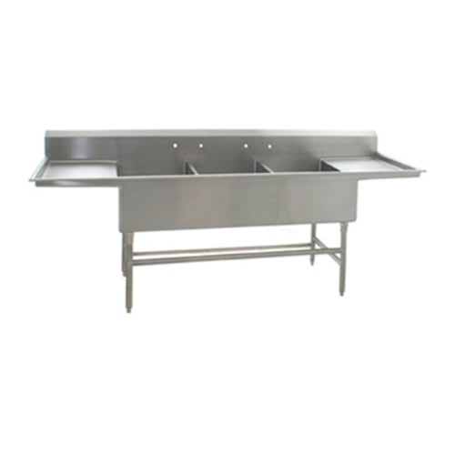 Spec-Master® Flush Front Sink, three compartment, 123-1/4"W x 30-1/2"D x 44-5/8"H overall size, 24"W x 27" front-to-back x 14" deep bowls, 24" drainboards on left & right, 10"H backsplash, (2) sets of splash mount faucet holes with 8" centers, includes (3) 3-1/2" basket drains, 14/304 stainless steel construction, stainless steel legs, crossrails, & adjustable bullet feet, NSF