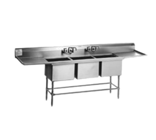 Spec-Master® FN Series Sink, three compartment, 91-1/2"W x 35"D, 14/304 stainless steel top, coved corners, 20" wide x 28" front-to-back x 14" deep compartments, 24" drainboard on right, 9-1/2"H backsplash with 1" upturn & tile edge, (2) sets of 8" OC splash mount faucet holes, rolled edges on front & sides, includes 3-1/2" basket drains, stainless steel crossbracing on all sides, stainless steel legs & adjustable bullet feet, NSF