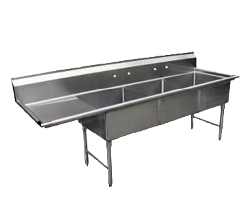 Sink, three compartment, 75-3/8"W x 24"D x 45"H, 18-gauge stainless steel construction, 18" x 18" x 12" deep compartments, 18" drainboard on left, 11-1/2"H backsplash, 8" OC splash mount faucet holes, includes (3) strainers with 3-5/8" dia. openings, stainless steel legs & side cross bracing, ETL