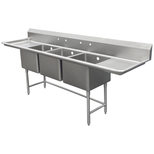 Scullery Sink, three compartment, 125"W x 24"D x 44"H overall size, (3) 16"W x 20" front-to-back x 14" deep compartments, (2) 36" left & right drainboards, 10"H backsplash, top & sink bowls have 3/4" coved radius, 3-1/2" drain openings, 14/300 stainless steel construction, 16 gauge stainless steel legs & gussets, adjustable feet, Made in USA