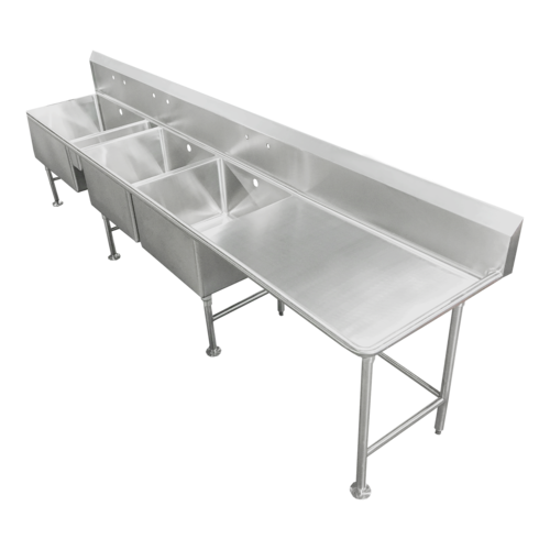 Scullery Sink, three compartment, 101"W x 28"D x 44"H overall size, (3) 24"W x 24" front-to-back x 14" deep compartments, (1) 24" right drainboard, 10"H backsplash, top & sink bowls have 3/4" coved radius, 3-1/2" drain openings, 14/300 stainless steel construction, 16 gauge stainless steel legs & gussets, adjustable feet, Made in USA