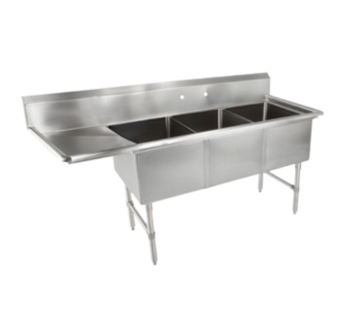"B" Series Sink, 3-compartment, 76"W x 29-1/2"D x 44"H overall size, (3) 18"W x 24" front-to-back x 14" deep compartments, (1) 18" left drainboard, 10"H boxed backsplash with 45° top and 2" return, (1) set of splash mount faucet holes with 8" centers, 3-1/2" die-stamped drain openings, 16/300 stainless steel construction, stainless steel legs, adjustable side bracing, adjustable bullet feet, NSF, CSA-Sanitation