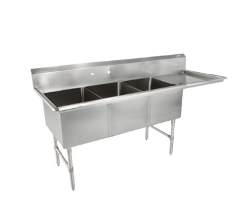 "B" Series Sink, 3-compartment, 76"W x 29-1/2"D x 44"H overall size, (3) 18"W x 24" front-to-back x 14" deep compartments, (1) 18" right drainboard, 10"H boxed backsplash with 45° top and 2" return, (1) set of splash mount faucet holes with 8" centers, 3-1/2" die-stamped drain openings, 16/300 stainless steel construction, stainless steel legs, adjustable side bracing, adjustable bullet feet, NSF, CSA-Sanitation