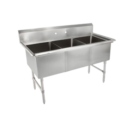 "B" Series Sink, 3-compartment, 59"W x 29-1/2"D x 44"H overall size, (3) 18"W x 24" front-to-back x 14" deep compartments, 10"H boxed backsplash with 45° top and 2" return, (1) set of splash mount faucet holes with 8" centers, 3-1/2" die-stamped drain openings, 16/300 stainless steel construction, stainless steel legs, adjustable side bracing, adjustable bullet feet, NSF, CSA-Sanitation