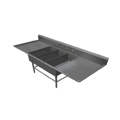 Pro-Bowl Platter Sink, 3-compartment, 105-1/4"W x 36-1/2"D x 43"H overall size, (3) 14"W x 31" front-to-back x 12" deep compartments, (2) 30" left & right drainboards, 10"H boxed backsplash with 45° top and 2" return, (1) set of splash mount faucet holes with 8" centers, 3-1/2" die-stamped drain openings, 16/300 stainless steel construction, stainless steel legs, adjustable front & side bracing, adjustable bullet feet, NSF, CSA-Sanitation, KD