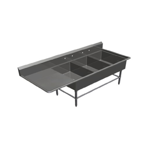 Pro-Bowl Sink, 3-compartment, 88-3/16"W x 33-1/2"D x 44-1/16"H overall size, (3) 20"W x 28" front-to-back x 14" deep compartments, (1) 24" left drainboard, 10"H boxed backsplash with 45° top & 2" return, (1) set of splash mount faucet holes with 8" centers, 3-1/2" die-stamped drain opening, 16/300 stainless steel construction, stainless steel legs, adjustable front & side bracing, adjustable bullet feet, NSF, CSA-Sanitation, KD