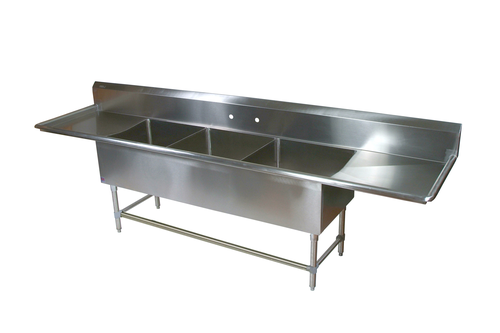 Pro-Bowl Sink, 3-compartment, 123-1/4"W x 25-1/2"D x 44-1/16"H overall size, (3) 20"W x 20" front-to-back x 14" deep compartments, (2) 30" left & right drainboards, 10"H boxed backsplash with 45° top and 2" return, (1) set of splash mount faucet holes with 8" centers, 3-1/2" die-stamped drain opening, 16/300 stainless steel construction, stainless steel legs, adjustable front & side bracing, adjustable bullet feet, NSF, CSA-Sanitation, KD