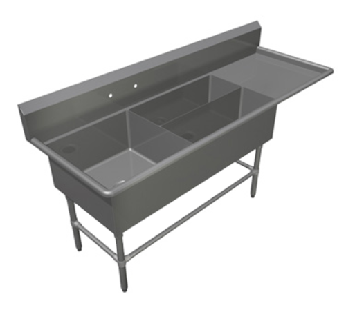 Pro-Bowl Platter Sink, 3-compartment, 84-3/16"W x 29-1/2"D x 43"H overall size, (1) 24"W x 24" front-to-back x 12" deep compartment, (2) 32"W x 12" front-to-back x 12" deep compartments, (1) 24" right drainboard, 10"H boxed backsplash with 45° top & 2" return, (1) set of splash mount faucet holes with 8" centers, 3-1/2" die-stamped drain openings, 16/300 stainless steel construction, stainless steel legs, adjustable front & side bracing, adjustable bullet feet, NSF, CSA-Sanitation, KD