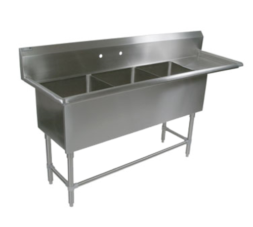 Pro-Bowl Sink, 3-compartment, 82-3/16"W x 25-1/2"D x 44-1/16"H overall size, (3) 20"W x 20" front-to-back x 12" deep compartments, (1) 18" right drainboard, 10"H boxed backsplash with 45° top & 2" return, (1) set of splash mount faucet holes with 8" centers, 3-1/2" die-stamped drain opening, 14/300 stainless steel construction, stainless steel legs, adjustable front & side bracing, adjustable bullet feet, NSF, CSA-Sanitation, KD