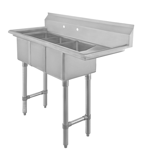 Convenience/Deli Sink, three compartment, 44-1/2"W x 19-1/2"D, 41"H, 18/304 stainless steel construction, (3) 10"W x 14" front-to-back x 10" deep compartments, 8-1/2"H backsplash, 12" right drainboard, 8" OC splash mount faucet holes, (3) 3-1/2" drain baskets included, stainless steel legs, crossbracing, & feet, NSF