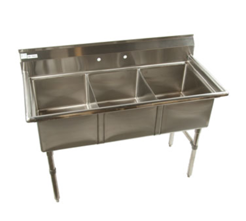 Economy Sink, three compartment, 53"W x 25-1/2"D x 41"H, 18/304 stainless steel construction, (3) 16" wide x 20" front-to-back x 11" deep compartments, 9"H backsplash, 8" O.C splash mount faucet holes, stainless steel gussets, legs, crossbracing & adjustable bullet feet, ETL