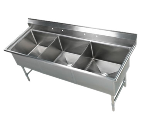 Elite Sink, three compartment, 77"W x 29-1/2"D x 41"H, 16/304 stainless steel construction, 24" x 24" x 14" deep compartments, 8-1/2"H backsplash, (2) sets of splash mount faucet holes on 8" centers, 1-1/2" diameter raised rolled edges on front & sides, 3-1/2" drains, stainless steel gussets, legs, crossbracing, & adjustable feet, requires (2) faucets (not included), ETL