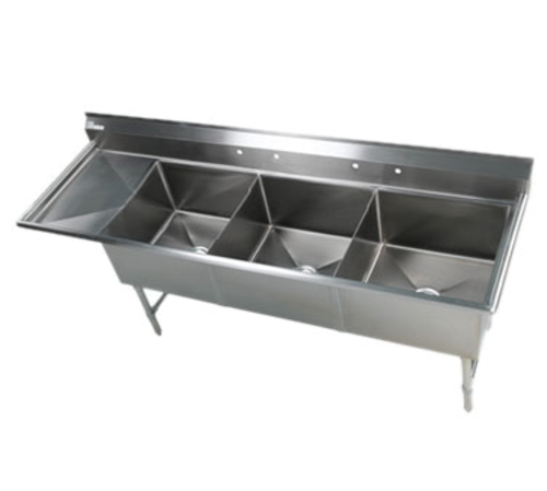 Elite Sink, three compartment, 92-1/2"W x 29-1/2"D x 41"H, 16/304 stainless steel construction, 24" x 24" x 14" deep compartments, 8-1/2"H backsplash, (2) sets of splash mount faucet holes on 8" centers, 18" drainboard on left, 1-1/2" diameter raised rolled edges on front & sides, 3-1/2" drains, stainless steel gussets, legs, crossbracing, & feet, requires (2) faucets (not included), NSF