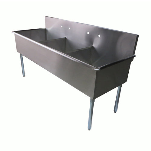 Budget Sink, three-compartment, 39"W x 24-1/2"D x 41"H overall size, (3) 12"W x 21" front to back x 12" deep compartments, 8"H backsplash with 2" return, (1) set of splash mount faucet holes with 8" centers, 3-1/2" die-stamped drain openings, 18/430 stainless steel construction, galvanized legs, adjustable plastic bullet feet (contact factory for NET pricing information)