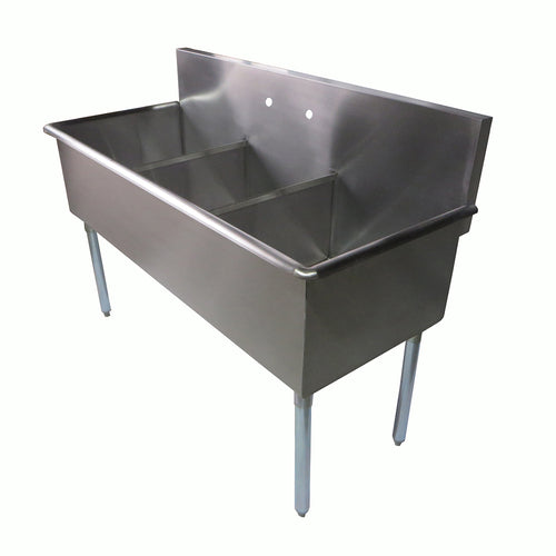 Budget Sink, three-compartment, 57"W x 21-1/2"D x 41"H overall size, (3) 18"W x 18" front to back x 12" deep compartments, 8"H backsplash with 2" return, (1) set of splash mount faucet holes with 8" centers, 3-1/2" die-stamped drain openings, 18/430 stainless steel construction, galvanized legs, adjustable plastic bullet feet (contact factory for NET pricing information)