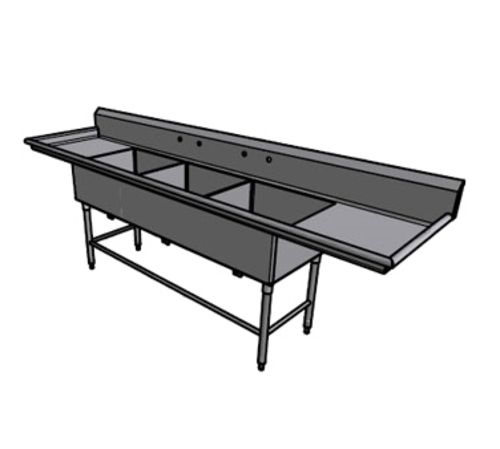 Sink, three compartment, 24" left & right drainboards, 28" front-to-back x 20"W x 12" deep sink bowls, 16/304 stainless steel construction, (C10) 2"D x 10"H backsplash, 220° sanitary rolled rim, NSF