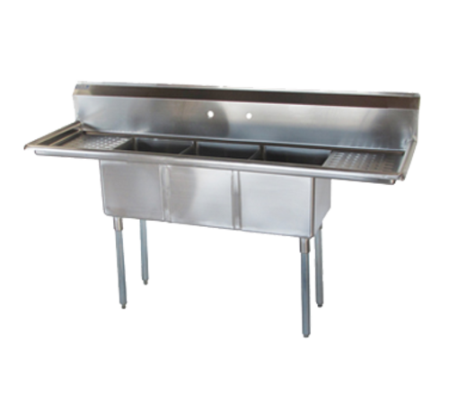 Sink, 3-compartment, with 15" left & right hand drainboard, 14" front-to-back x 10"W compartment, 10"D, with 7"H splash, galvanized legs, 18/304 stainless steel, NSF