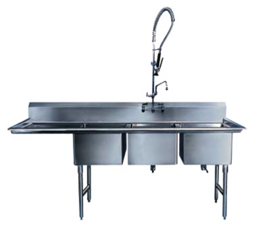 Sink, three compartment, with left-hand 24" drainboard, 18" front-to-back x 24" wide x 12" deep with backsplash, stainless steel legs & adjustable feet, 16/304 stainless steel, NSF