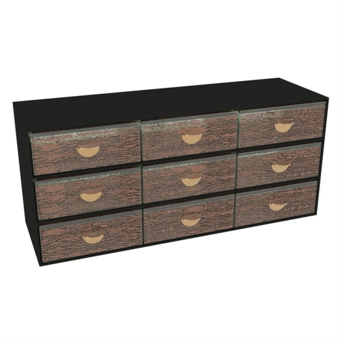 Bento Lunch Box Server, 17-1/10" x 5-1/2" x 7-7/10"H, 3-tier, (9) Lunch Bento lunch box drawers with handles & covers, re-fill from back, stackable up-to two Lunch Bento servers, glass, crackled pattern, tobacco brown, My Glass Studio