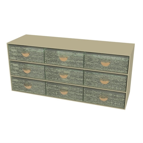 Bento Lunch Box Server, 17-1/10" x 5-1/2" x 7-7/10"H, 3-tier, (9) Lunch Bento lunch box drawers with handles & covers, re-fill from back, stackable up-to two Lunch Bento servers, glass, crackled pattern, artichoke, My Glass Studio