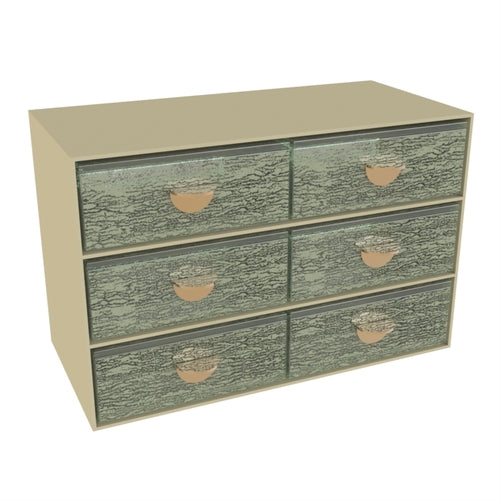 Bento Lunch Box Server, 11-3/10" x 5-1/2" x 7-7/10"H, 3-tier, (6) Lunch Bento lunch box drawers with handles & covers, re-fill from back, stackable up-to two Lunch Bento servers, glass, crackled pattern, artichoke, My Glass Studio