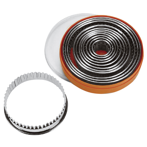 Pastry Cutters, 9-piece, cut sizes: 1-3/16", 1-37/64", 1-31/32", 2-23/64", 2-3/4", 3-5/32", 3-35/64", 3-15/16", & 4-21/64" dia., rolled upper rim, fluted lower edge, 18/10 stainless steel