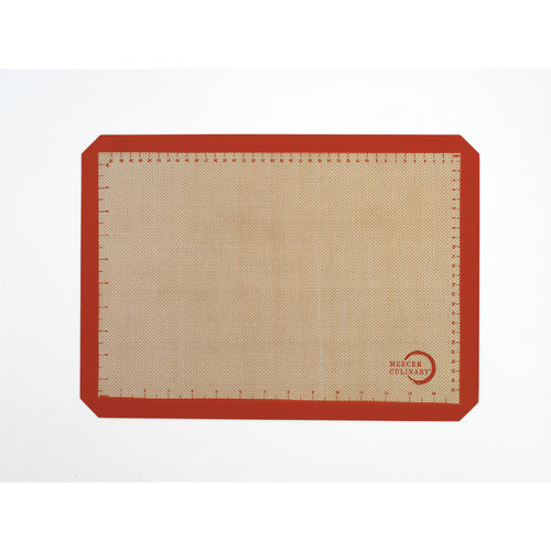 Bake Mat, half size, 11-7/8" x 16-1/2", orange border with printed measure marks in inches and cms, temperature resistant to 480°F/250°C, fits all standard half size sheet pans, angle cut corners for better pan fitting, silicone