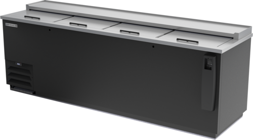 Frosty Brew™ Bottle Cooler, 95"W x 26-5/8"D x 33-3/4"H, 28.63 cu. ft., (4) sliding lids, (6) adjustable epoxy coated wire dividers, case capacity: 39 cases (12 oz. bottles) or 55-3/4 cases (12 oz. cans), flat top, holds below 32° F, deep well design, adjustable dividers, bottle cap opener & cap catcher, black painted steel exterior, galvanized interior, stainless steel top, self-contained refrigeration, R290 Hydrocarbon refrigerant, 1/4 HP, cULus, UL EPH Classified, UL-Sanitation, Made in USA