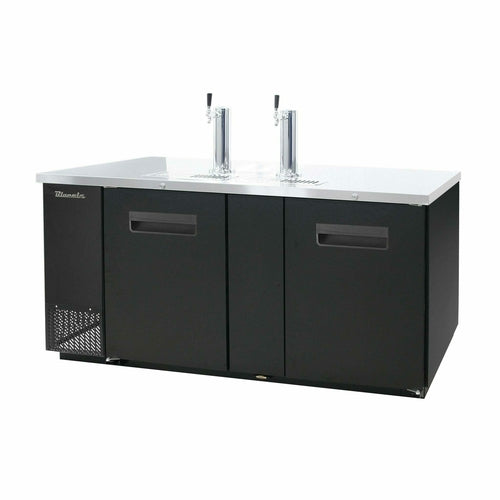Keg Cooler, 69-3/8"W, side-mounted self-contained refrigeration, stainless steel top, (2) locking doors with recessed handles, (3) 1/2 barrels capacity, (1) 3" dia. stainless steel insulated beer columns with single faucet, (1) 3" dia. stainless steel insulated beer columns with double faucet, interior LED lighting, automatic defrost, galvanized steel interior with stainless steel floor, black laminated exterior, R290 Hydrocarbon refrigerant, 3/8 HP, 3.5 amps, 115v/60/1-ph, NEMA 5-15P, cUL, UL, ETL-Sanitation