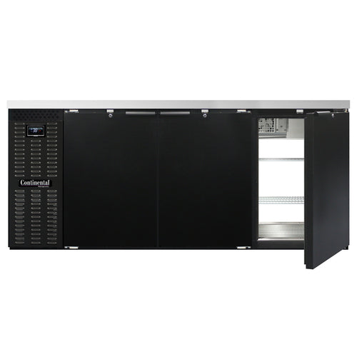 Refrigerated Back Bar Cooler, pass-thru, 79"W, 34-3/4"H, 28.0 cu. ft., front breathing, stainless steel top, (6) doors with locks, electronic controller with digital display & hi-low alarm, black enamel finish exterior, stainless steel interior back & side panels with reinforced stainless steel floor, epoxy coated steel shelves, self-contained refrigeration, R290 Hydrocarbon refrigerant, 1/3 HP, cETLus, NSF