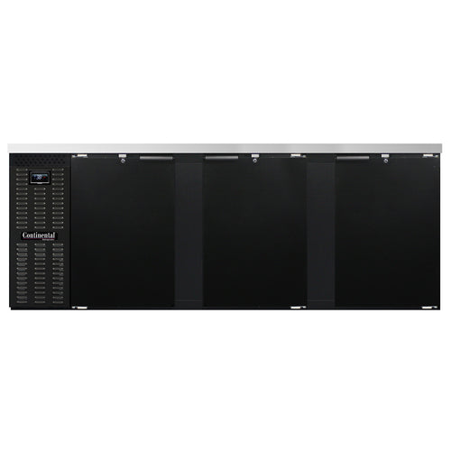 Refrigerated Back Bar Cooler, 90"W, 34-3/4"H, 35.0 cu. ft., front breathing, stainless steel top, (3) doors with locks, electronic controller with digital display & hi-low alarm, black enamel finish exterior, stainless steel interior back & side panels with reinforced stainless steel floor, epoxy coated steel shelves, self-contained refrigeration, R290 Hydrocarbon refrigerant, 1/3 HP, cETLus, NSF