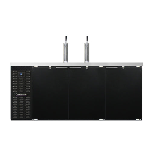 Keg Cooler, 79"W, 28.0 cu. ft., front breathing, (3) barrel or straight wall keg capacity, stainless steel top with (2) columns & drainer, 23" shallow depth, (3) doors with locks, electronic controller with digital display & hi-low alarm, black enamel finish exterior, stainless steel interior back & side panels with reinforced stainless steel floor, self-contained refrigeration, R290 Hydrocarbon refrigerant, 1/3 HP, cETLus, NSF