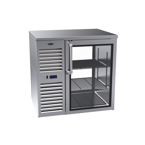 Pass-Thru Refrigerated Back Bar Cabinet, two-section, 36"W, self-contained refrigeration mounted on left, 30°F to 40°F temperature range, (2) hinged doors with locks, (2) adjustable wire shelves, (1) bottom rack per door, LED lighting, automatic defrost timer & condensate evaporator, stainless steel interior, R290 Hydrocarbon refrigerant, 1/5 HP, 115v/60/1-ph, 2.8 amps, cord with NEMA 5-15P, NSF7 Open Food Certified, ETL-Sanitation, ETLus