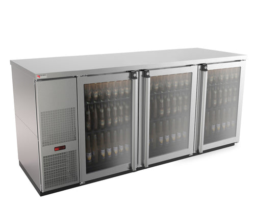 Pro-Line™ E-Series™ Refrigerated Back Bar Cabinet, three-section, 80"W, self-contained refrigeration, 30.8 cu ft. interior capacity, (3) hinged glass doors with locks, (2) flat shelves & (4) divider shelves, adjustable digital thermostat, interior lighting, front ventilated, automatic condensate evaporator, stainless steel interior walls & floor, stainless steel top & exterior, R290 Hydrocarbon refrigerant, 1/3 HP, 115v/60/1-ph, 3.0 amps, 8' cord, NEMA 5-15P, cETLus, ETL-Sanitation