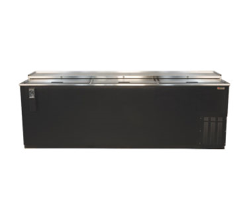 Pro-Line™ Flat Top Bottle Cooler, deep well, 95-3/16"W, self-contained refrigeration, 69.0 cu. ft. capacity, (3) sliding doors with locks, (7) epoxy-coated dividers, incandescent interior lighting, raised glass rail, includes cap opener/catcher on front, automatic condensate evaporator, galvanized interior (NSF-approved), stainless steel top, black vinyl over steel exterior, R290 Hydrocarbon refrigerant, 1/4 HP, 115v/60/1-ph, 2.0 amps, 8' cord, NEMA 5-15R, cETLus, ETL-Sanitation
