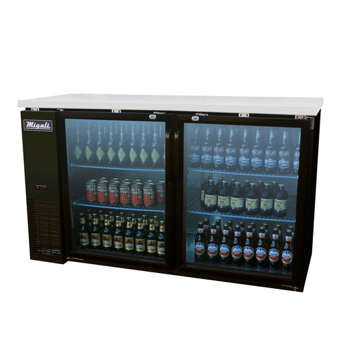 Competitor Series® Refrigerated Back Bar Cabinet, two-section, 60.8” W, 15.8 cu. ft. capacity, side mount self-contained refrigeration system, (2) hinged glass doors with locks, (4) shelves, (756) 12 oz cans or (456) 12 oz bottles capacity, LED interior lighting, digital controller/display, (+33° to +38°), forced air cooling, black steel exterior, stainless steel interior & top, (4) leveling feet, R290 Hydrocarbon refrigerant, 1/3 HP, 115v/60/1-ph, 6.4 amps, NEMA 5-15P, cETLus, ETL-Sanitation, Migali® Plant-A-Tree Pledge: Migali® pledges to plant a tree for every product sold in partnership with the Earth Day Network