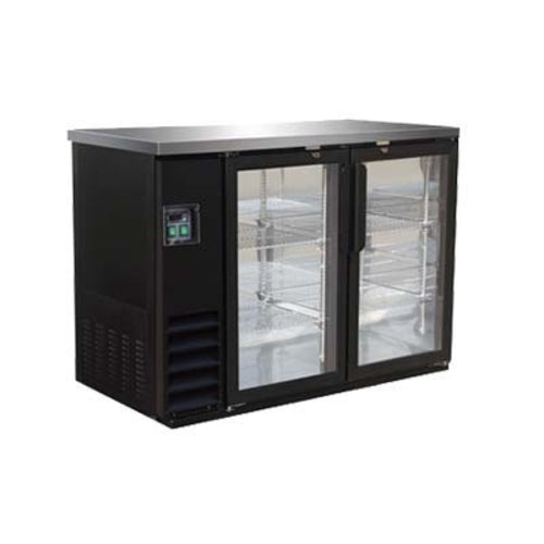 IKON Refrigerated Back Bar Storage Cabinet, two-section, 14.16 cu. ft. capacity, 61-1/10"W x 24-2/5"D x 41-3/4"H, stainless steel top, (2) hinged glass doors (lockable), (4) adjustable shelves, (432) 12 oz cans or (324) 12 oz bottles capacity, electronic thermostat, 33° to 40°F temperature range, digital LED temperature display, stainless steel interior, black exterior, left-side mounted self-contained refrigeration, R290 refrigerant, 4" casters (2) braked, 115v/60/1-ph, cord with NEMA 5-15P, 0.40 hp, 3 amps, cETLus, ETL-Sanitation