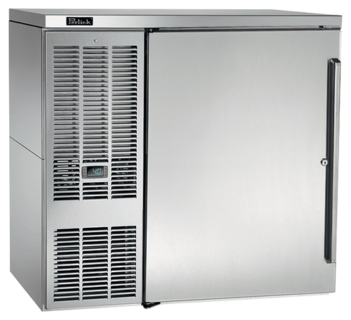Refrigerated Back Bar Cabinet, one-section, 36"W, Self-contained refrigeration front vented, 7.4 cu. ft. internal volume, stainless steel top sides, and front, Solid door hing left with lock, stainless steel interior, (2) vinyl-coated shelves & (1) front shelf per section, digital thermostat, LED interior lighting, automatic defrost & evaporate condensate, includes floor drain, R290 Hydrocarbon refrigerant, 1/5 HP, NSF, cULus (QuickShip)