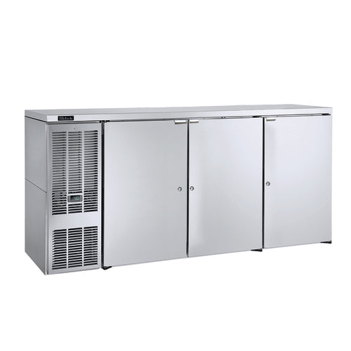 Direct Draw Draft Beer Dispenser, three-section, 84"W, self-contained refrigeration, holds (4) half barrels (LESS TAPPING), 33-40°F temperature range, (3) solid doors, digital thermostat, front vented, automatic defrost & evaporator condensate, automatic defrost & condensate evaporator, includes floor drain, stainless steel top, ends & back exterior, 1/4 HP, R290 Hydrocarbon refrigerant, NSF, cULus