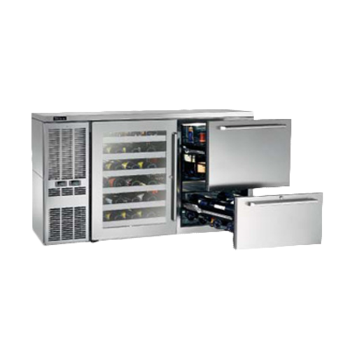 Dual-Zone Refrigerated Back Bar Storage Cabinet, two-section, 60"W, self-contained refrigeration, 15.0 cu.ft. interior capacity, digital thermostat, LED interior lighting, door locks, front vented, automatic defrost & condensate evaporator, includes floor drain, stainless steel interior, side mount compressor, 1/5 HP, R290 Hydrocarbon refrigerant, NSF, cULus