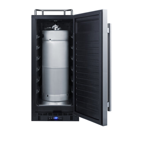 Draft Beer Cooler Dispenser, built-in or freestanding, 15"W, 2.9 cu. ft. capacity, holds (1) 1/6 or mini keg, digital thermostat, 34° to 50°F temperature range, automatic defrost, chrome guard rail, (1) reversible right hinged stainless steel door, (2) adjustable chrome wire shelves, stainless steel cabinet, (4) 2-1/2" locking casters, self contained rear-mounted compressor, R600a Hydrocarbon refrigerant, 115v/60/1-ph, 1.25 amps, ETL, ETL-Sanitation (Commercial) (tapping equipment not included)