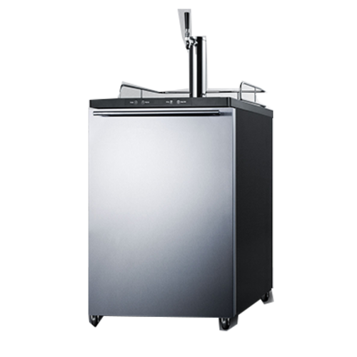 Draft Beer Cooler Dispenser, freestanding, 24"W, 5.6 cu. ft. capacity, holds half, quarter, 1/6 or mini kegs, digital thermostat, +33° to +50°F temperature range, deep chill function, automatic defrost, Sankey American tap system, single draft tower, 5 lb. CO2 tank & regulator, connection hardware, removable drip tray, (1) reversible right hinged 304 stainless steel door, thin horizontal brushed stainless steel handle, chrome guard rail, black cabinet, stainless steel floor cover, (4) 2-1/2" casters, self contained rear-mounted compressor, R600a Hydrocarbon refrigerant, 115v/60/1-ph, 0.86 amps, UL, ULC, ETL-Sanitation (Commercial)