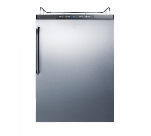 Draft Beer Cooler Dispenser, built-in or freestanding, 24"W, 5.6 cu. ft. capacity, holds half, quarter, 1/6 or mini kegs, digital thermostat, +33° to 50°F temperature range, deep chill function, automatic defrost, (1) factory reversible 304 stainless steel door, chrome guard rail, curved brushed stainless steel handle, removable drip tray, black cabinet, stainless steel floor cover, (4) level legs & (4) 2-1/2" locking casters, self contained rear-mounted compressor, R600a Hydrocarbon refrigerant, 115v/60/1-ph, 0.86 amps, cETLus (Residential)