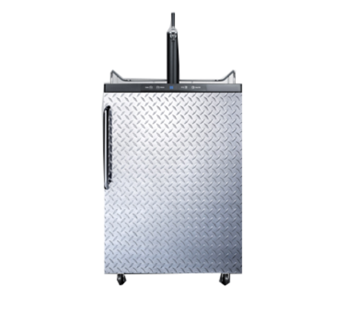 Draft Beer Cooler Dispenser, built-in or freestanding, 24"W, 5.6 cu. ft. capacity, holds half, quarter, 1/6 or mini kegs, automatic defrost, digital thermostat, +33° to +50°F temperature range, Sankey American tap, single draft arm, 5 lb. CO2 tank & regulator, connection hardware, curved polished stainless steel towel bar handle, chrome guard rail, removable drip tray, (1) factory reversible right hinged diamond plate door, black cabinet, stainless steel floor cover, (4) 2-1/2" locking casters, self contained rear-mounted compressor, R600a Hydrocarbon refrigerant, 115v/60/1-ph, 0.86 amps, UL, ULC (Residential)