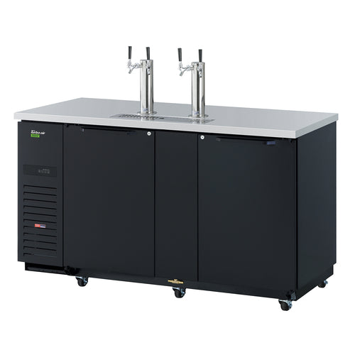 Super Deluxe Beer Dispenser, 69"W x 27-1/4"D x 37-1/8"H, self-cleaning condenser equipped, (2) swing doors with locks, stainless steel countertop & black exterior, stainless steel inside walls & floor, galvanized steel interior top, (3) 1/2 barrel capacity, (2) 3" dia. stainless steel insulated beer columns with double faucet, door locks, recessed handles, side mount, front air intake, R290 Hydrocarbon refrigerant, 1/3 HP, 115v/60/1-ph, 2.5 amps, cord with NEMA 5-15P, ETL-Sanitation, cETLus, ENERGY STAR®